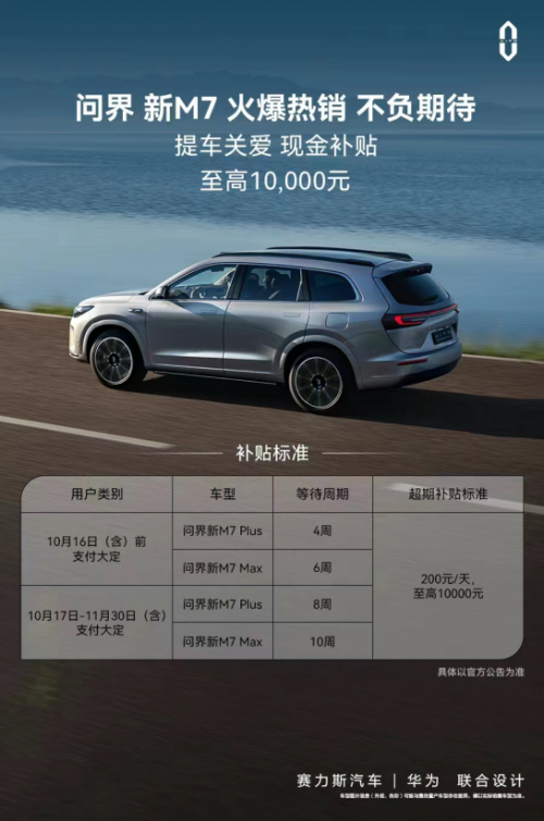 面对问界新M7持续火爆的订单,赛力斯汽车全力以赴加速产能提升,联合供应链新投入超10亿,新增人力超2万,同时工厂不仅每日新增了一个班次,更是22小时持续生产,以便尽快将问界新M7交付用户手中。除加快产品产能提升外,AITO问界还于近日推出了“新M7提车关爱计划”,超出等待周期的下定用户,可根据超出天数,得到每天200元的关爱补偿,最高可享1万元,全力保障用户权益。